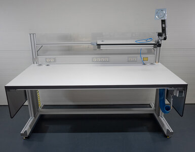 Mit verschiedenen Konstruktionen von MiniTec lassen sich die Arbeitsplätze optimal anpassen. Leitfähige Profilverbinder sorgen für eine sichere Montage, während leitfähige Montagewinkel mit spezieller Verbindungstechnik eine zuverlässige Ableitung ermöglichen. Zusätzlich sind die Tische mit Gelenkfüßen ausgestattet, um Bodenunebenheiten auszugleichen. Eine Tischplatte, eine ableitfähige Polycarbonatscheibe an der Rückseite sowie einer Ablage bieten umfassenden Schutz. Für eine sichere und geordnete Stromversorgung können zudem Kabelkanäle integriert werden.