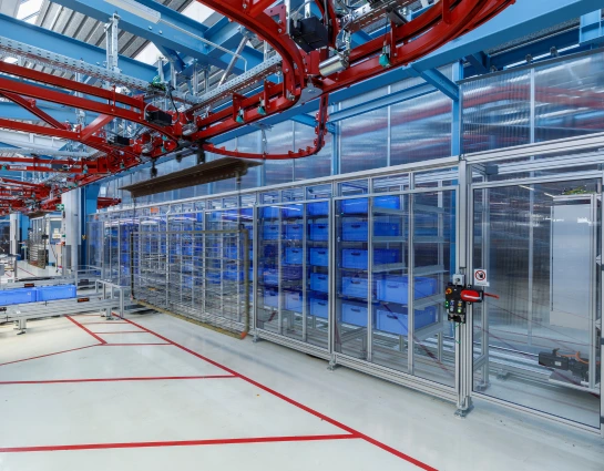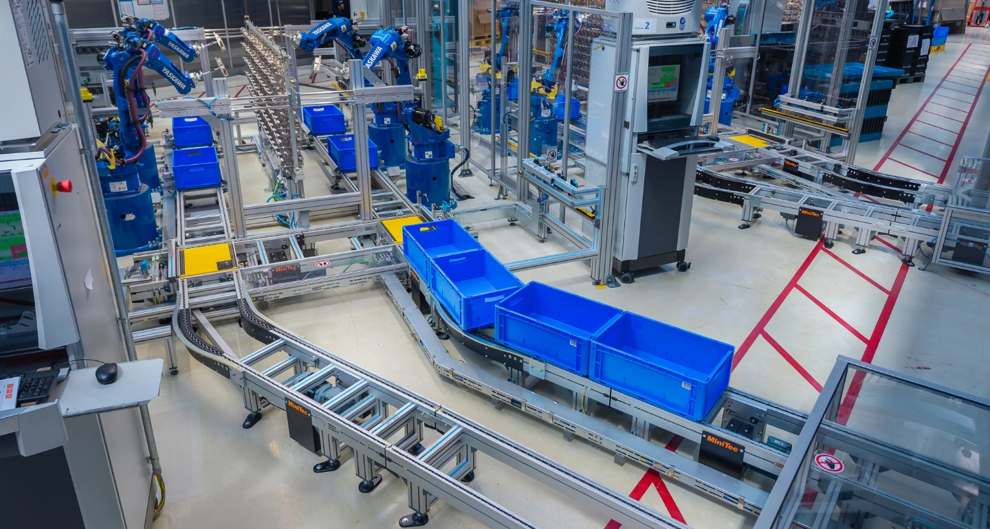 Filled KLTs travel along a MiniTec FMS conveyor system to the storage rack, and empty boxes are automatically made available to the robots again.