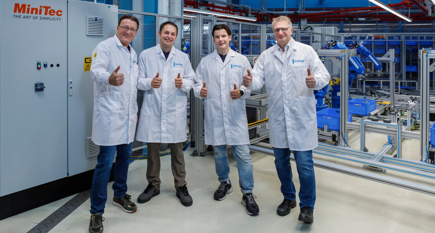 Thumbs up for the new automation solution (from left): Stefan Wache (MiniTec), Simon Bublies, Moritz Benzing, and Joachim Hölzl (all HMT).