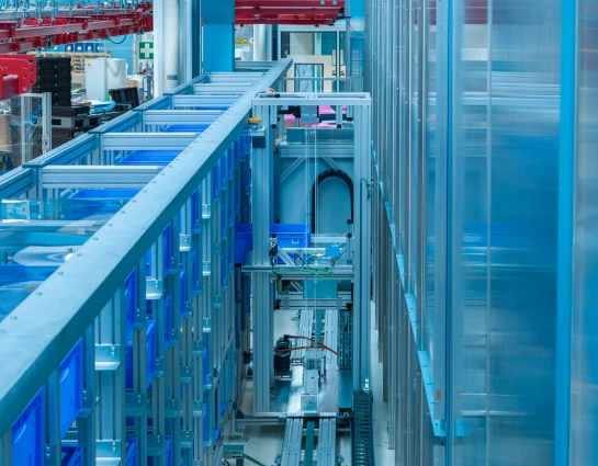 At the storage rack, a storage shuttle – also developed by MiniTec – handles the automatic storage of the KLTs, moving back and forth as needed. It also transports components for visual inspection. This area is equipped with a control station where employees can see which components are currently in the storage system.