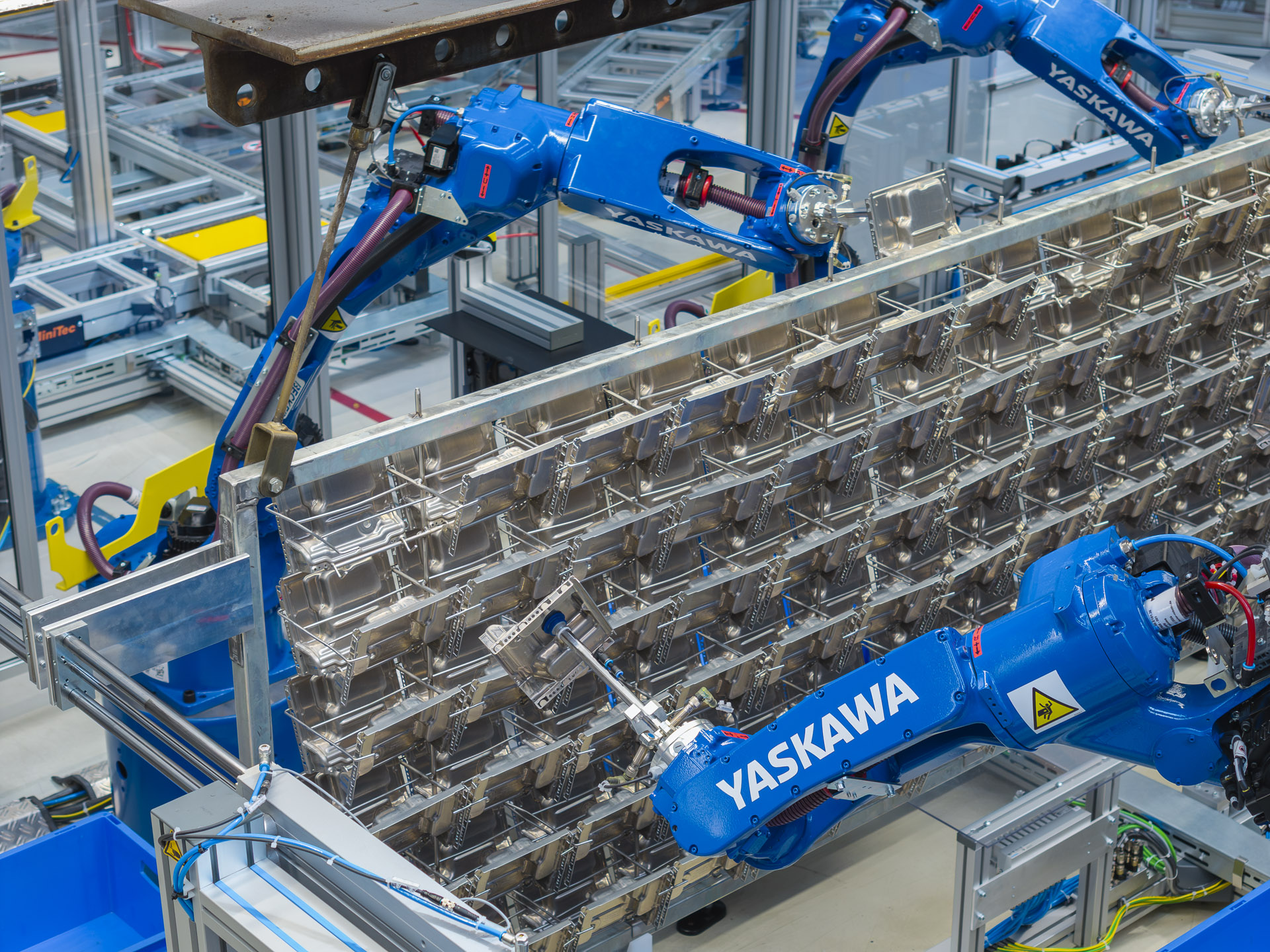 Eight MOTOMAN GP12 robots remove the components and place them into KLT containers.