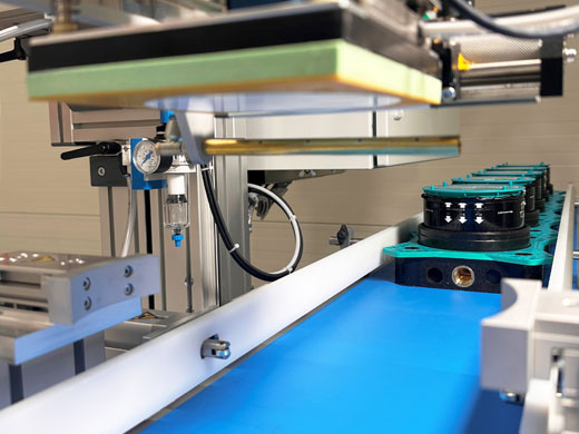 Now the process begins. First, the component is automatically transported to the labelling station. There the label is applied in the centre also automatically. The finished base body is then conveyed out of the station and removed manually at the removal station.