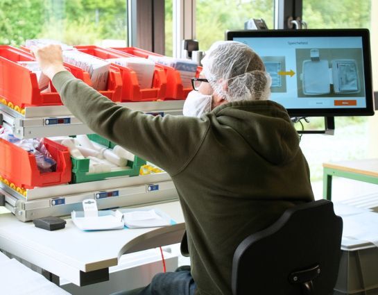 At the RHW, workers assemble test kits for medical laboratories—each kit consisting of various components packed into a resealable plastic bag. Given the approximately 300 different set variations, ensuring the correct contents in each bag is a challenging task. This is where the MiniTec SmartAssist system delivers real value.