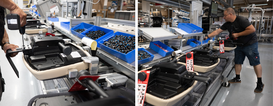 Once an operator completes a step, they advance the workpiece carrier using a foot pedal. After assembly is finished, the chair is removed, and the empty carrier is returned and lowered via foot pedal. In the future, control via a display is also planned. These displays will show operators their work orders and indicate which chairs need to be assembled.