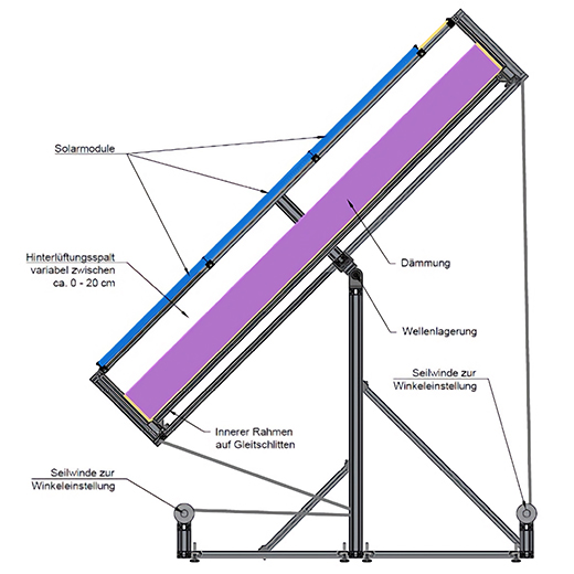 The frame construction consists of an outer frame to which the solar modules are attached and an inner frame to which the insulation is attached. The entire frame is pivoted on a stand. The inner frame can be moved using sliding carriages. This allows the distance from the insulation to the solar modules to be varied.