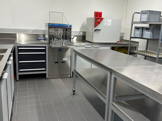 The focus of the new respiratory protection workshop is the so-called black area, where contaminated breathing apparatus and the associated masks are cleaned and disinfected after use. Thanks to the flexibility of the MiniTec modular profile system, the respiratory protection workshop could be ideally adapted to the spatial conditions and requirements of the fire department in order to realize an ergonomic workflow. MiniTec also supplied various cylinder trolleys and roller tables to ensure optimum logistics within the new fire station. The furniture elements from the product range for the furnishing of breathing apparatus workshops are easy to clean and are also characterized by high durability and longevity.