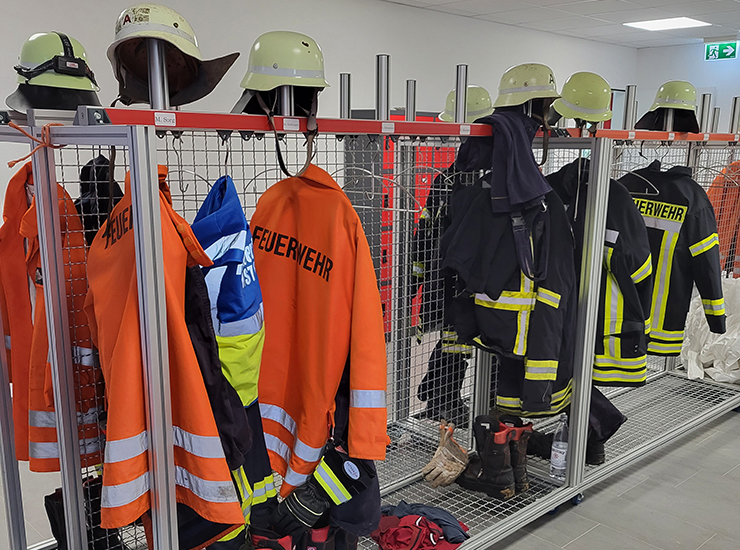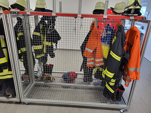 Of course, the special requirements of the fire department were taken into account during the design phase. This starts with mesh mats for shoes and boots and ranges from special helmet holders to movable coat hooks. It was also important to Oliver Käss that the coat racks have castors and can therefore be moved flexibly: "This is an advantage when cleaning, for example. Because boots and clothing are often very dirty after use and leave their mark accordingly. Thanks to the castors, we can easily move the wardrobes outside and clean them. But the mobility of the wardrobes also gives us more flexibility in general, as we can quickly move them from one room to another." The Niederstetter fire department was also able to record clear advantages on the financial side, as the MiniTec checkrooms cost just half as much as ready-made solutions.