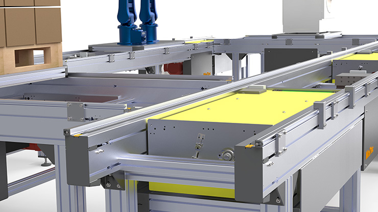 The workpiece carriers or pallets are transported on accumulation roller chains, which enables a smooth and efficient material flow. The distance between these accumulation roller chains can be adjusted to the project-specific pallet size. This means that the transport system can be optimally adapted to individual customer requirements and offers versatility in a wide range of industrial environments.