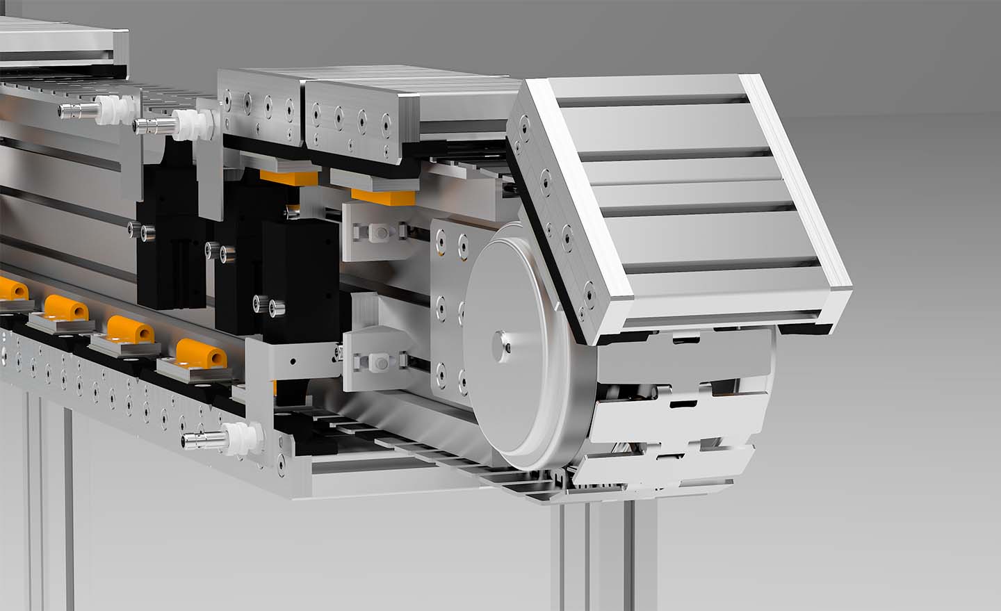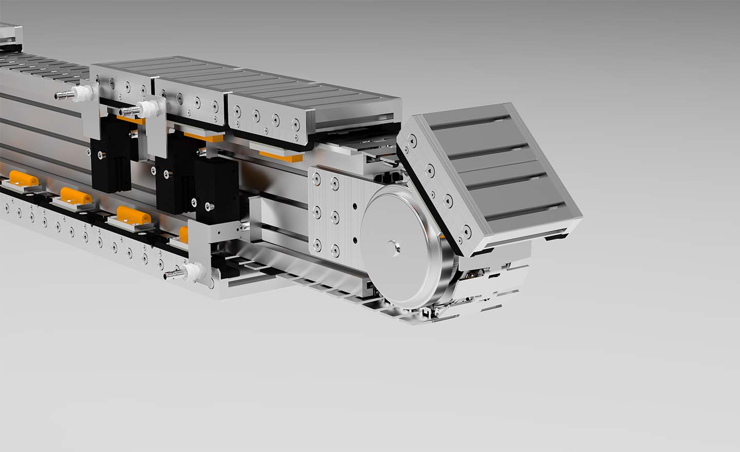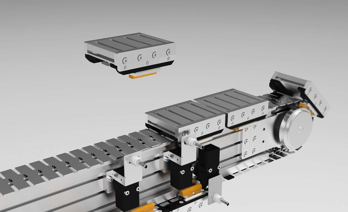 The pallet circulation system is therefore compatible with all the components of our modular system. Additions such as test stations, assembly or unloading stations can be integrated seamlessly.