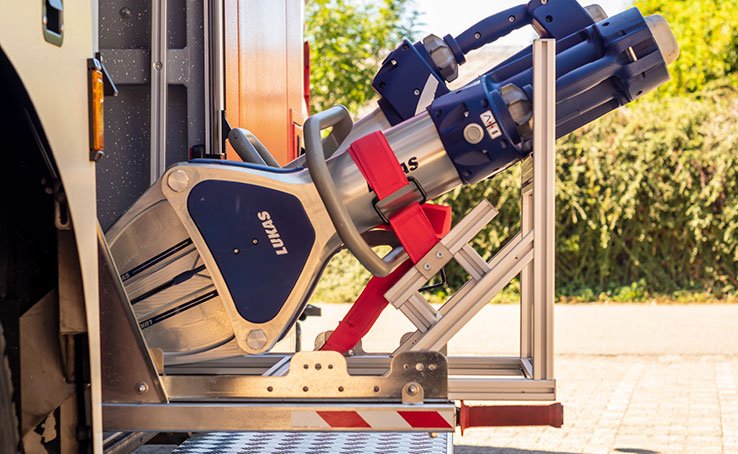 MiniTec offers practical racks made from the aluminium profile system for storing LUKAS eDRAULIC spreaders and cutters.